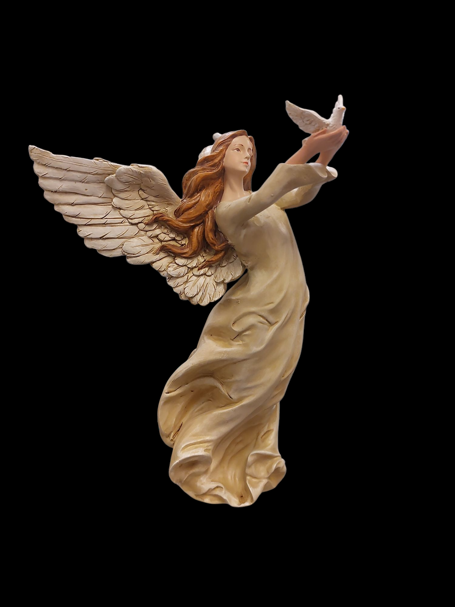 Hand-painted with glorious detail, this angel would be a great addition to any angel collection! Made of resin, stands approximately 10 inches tall.