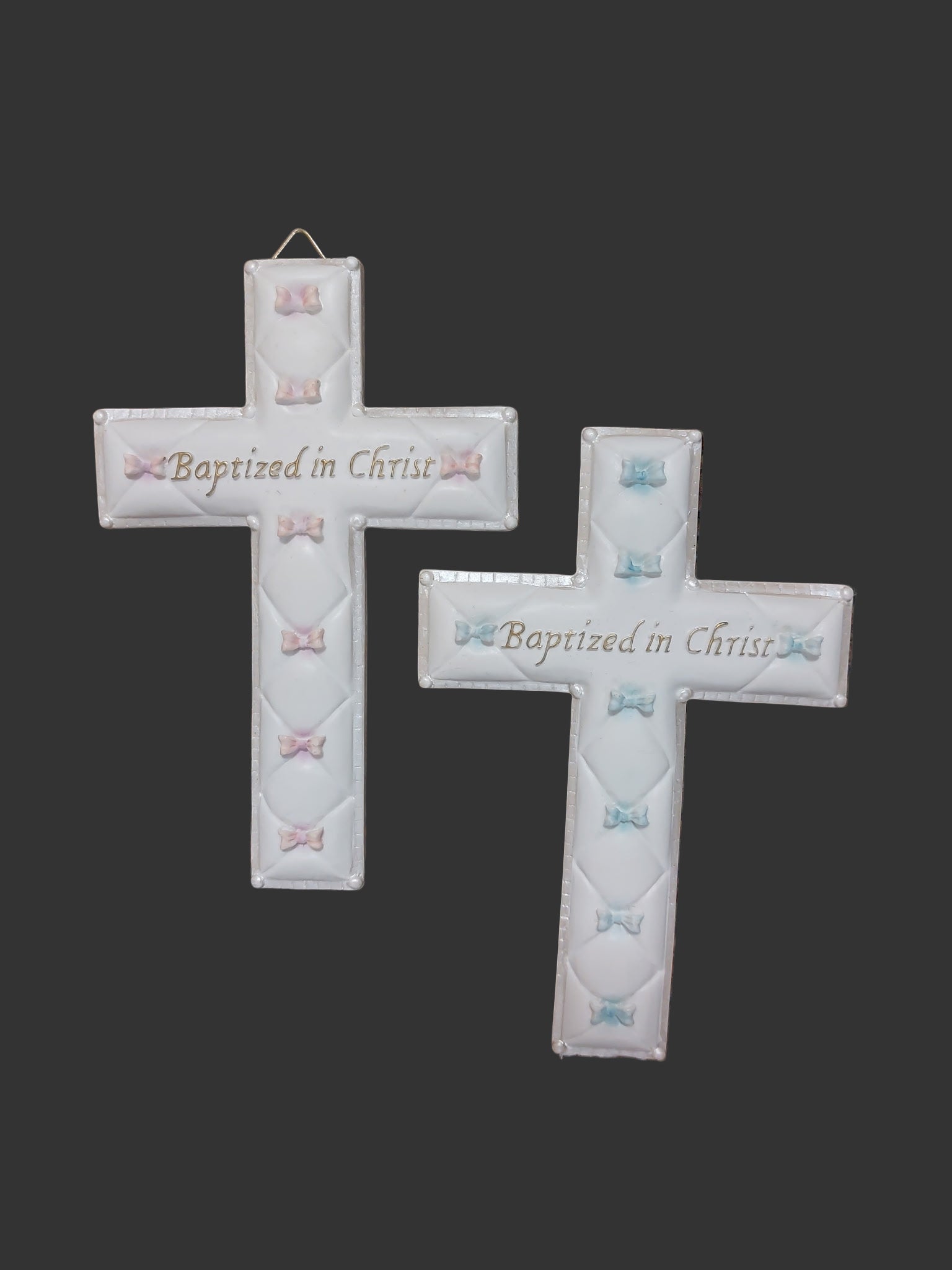 BAPTISMAL CROSS AFFIXED WITH BOWS IN PINK AND BLUE.