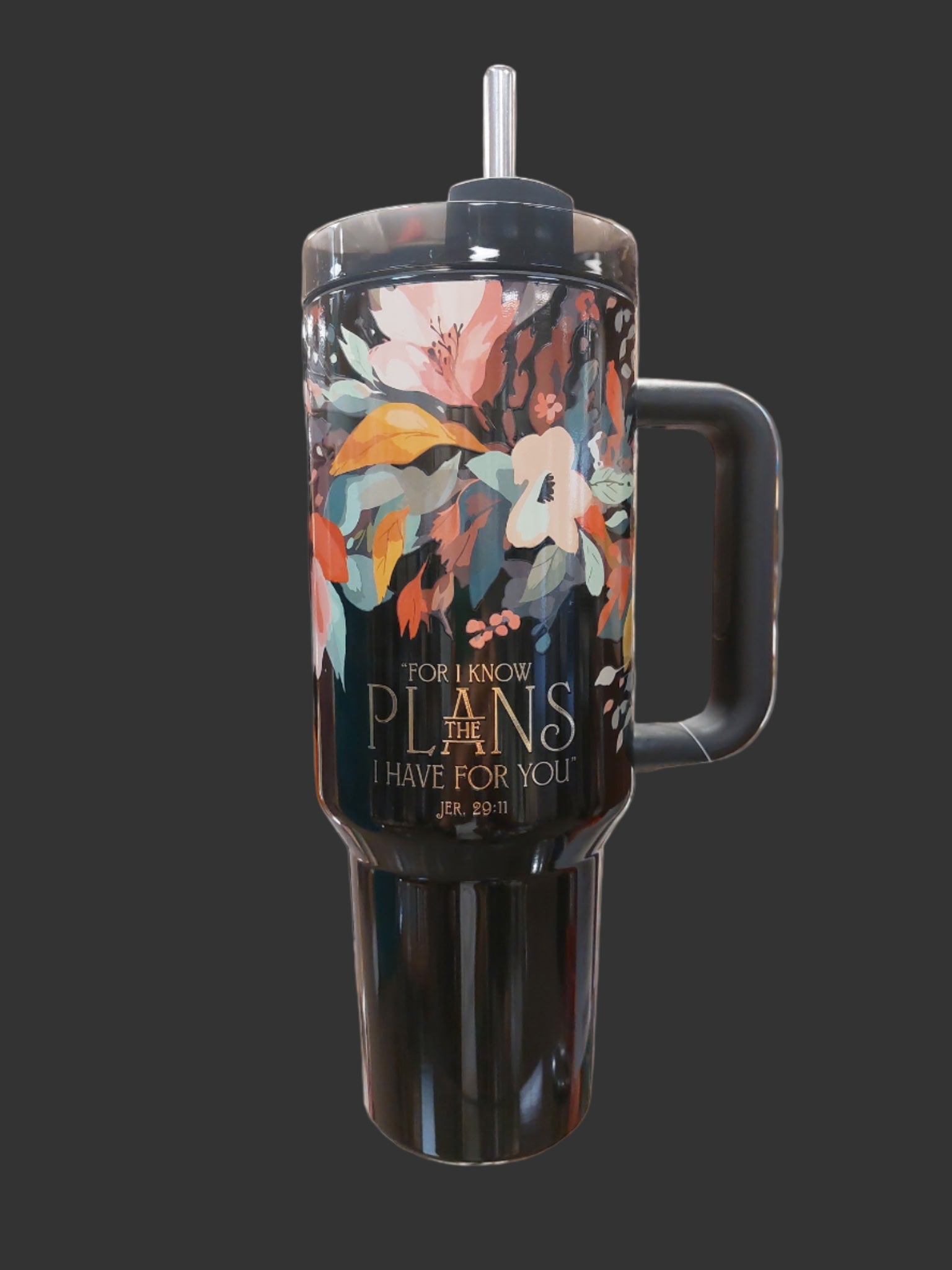 FOR I KNOW THE PLANS TUMBLER WITH STRAW IN BLACK FLORAL. THIS TUMBLER IS 40 OUNCES AND IS MADE OUT OF STAINLESS STEEL.