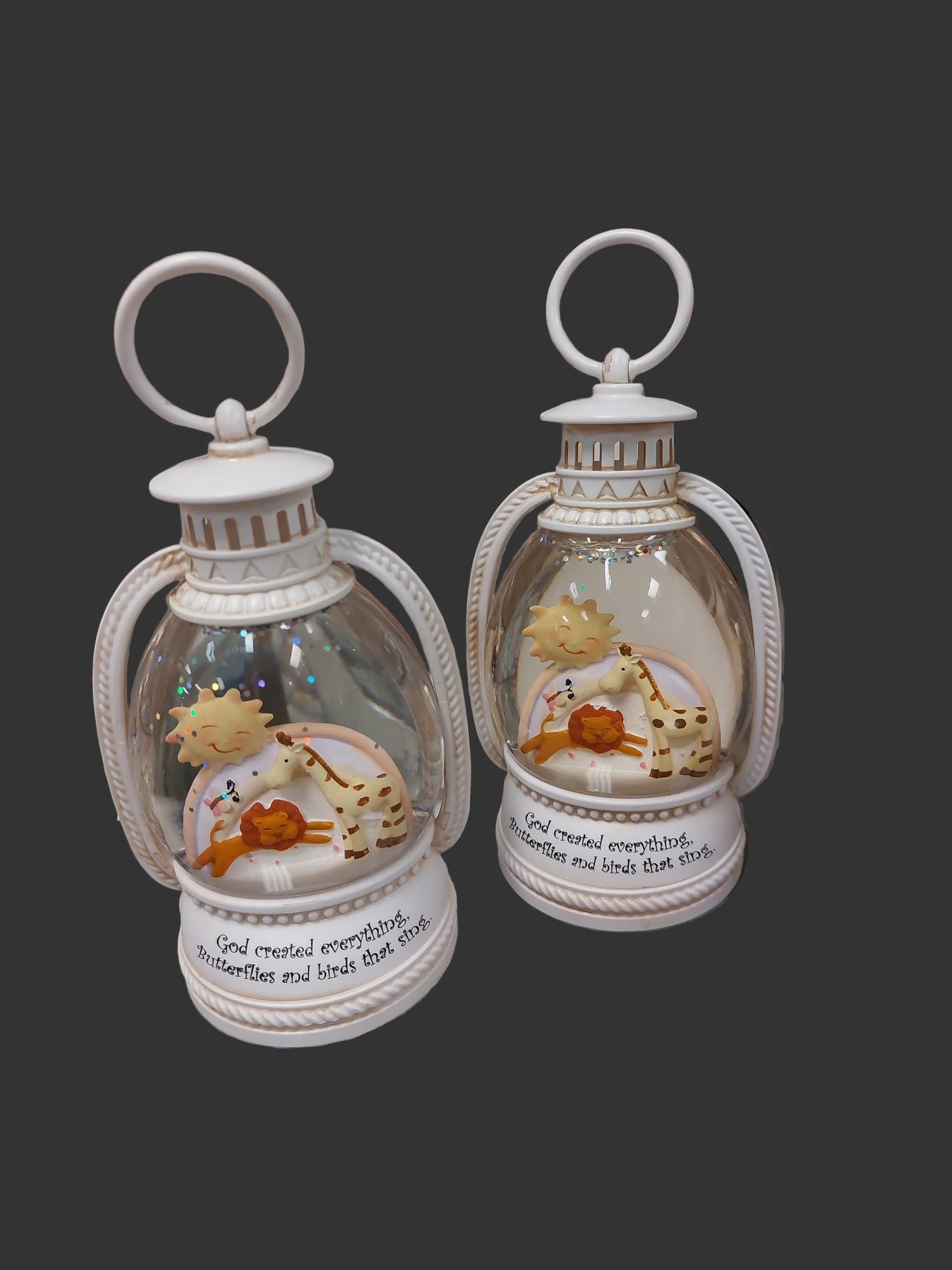 SMALL "GOD CREATED EVERYTHING, BUTTERFLIES AND BIRDS THAT SING." LANTERN FEATURING THE SUN AND ANIMAL FIGURINES. THE LIGHTED GLITTER LATERN IS OPERATED BY 2 AAA BATTERIES.