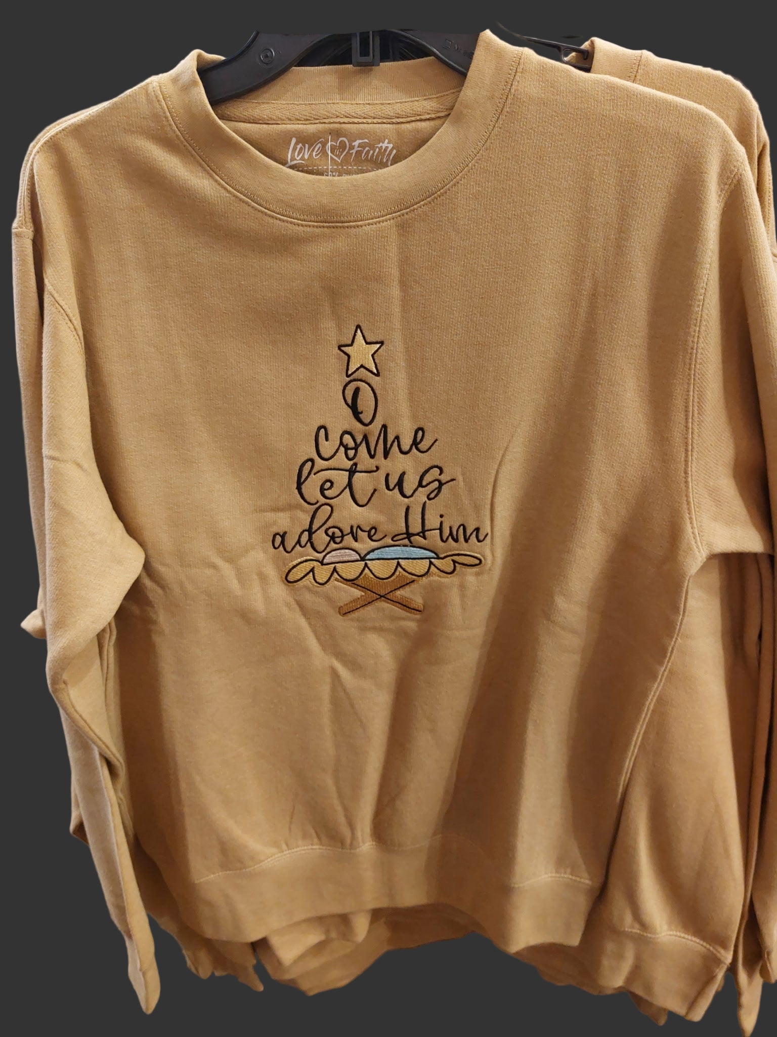 BEIGE O' COME LET US ADORE HIM CREWNECK SWEATSHIRT ADORNED WITH BABY JESUS IN HIS MANGER. PERFECT FOR THE HOLIDAY SEASON! AVAILABLE IN SIZES S-2XL.