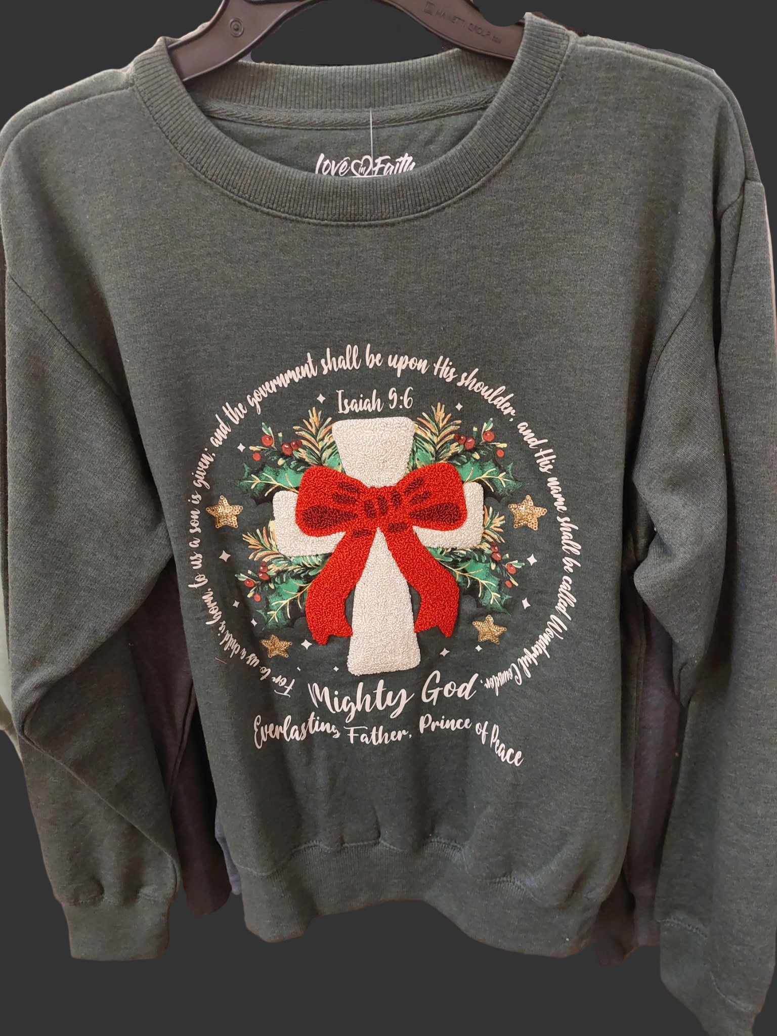 ISAIAH 9:6 MIGHTY GOD EVERLASTING FATHER, PRINCE OF PEACE DARK GREEN CREWNECK SWEATSHIRT. THIS CREWNECK FEATURES A 3-DIMENSIONAL CROSS WITH BOW.