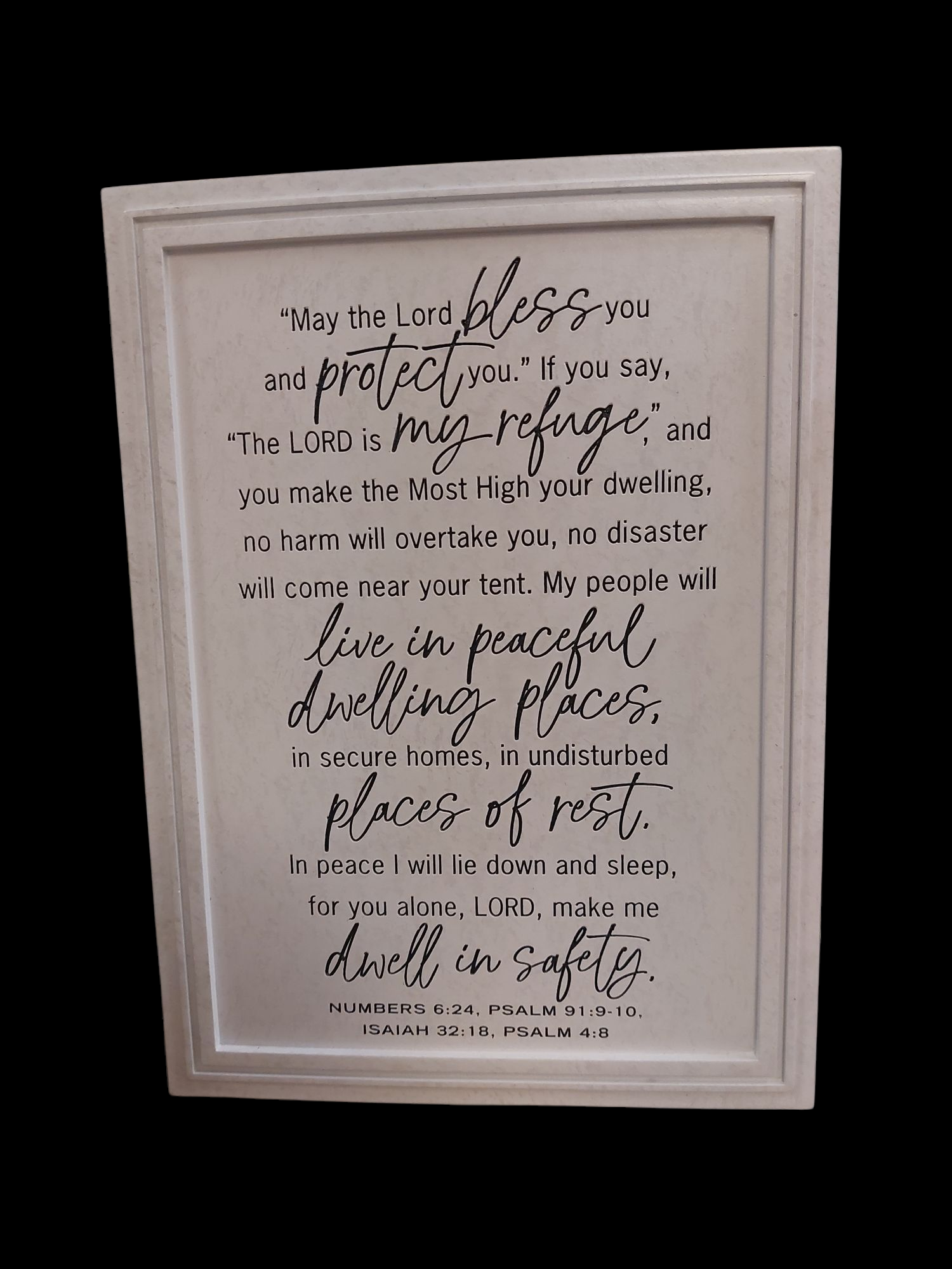 States, “May the Lord bless you and protect you.” If you say, “The LORD is my refuge”, and you make the Most high your dwelling, no harm will overtake you, no disaster will come near your tent. My people will live in peaceful dwelling places, in secure homes, in undisturbed places of rest. In peace I will lie down and sleep, for you alone, LORD, make me dwell in safety. (Numbers 6:24, Psalm 91:9-10, Isaiah 32:18, Psalm 4:8.” Can both hang on the wall and sit on the counter. Stands 8x6 inches