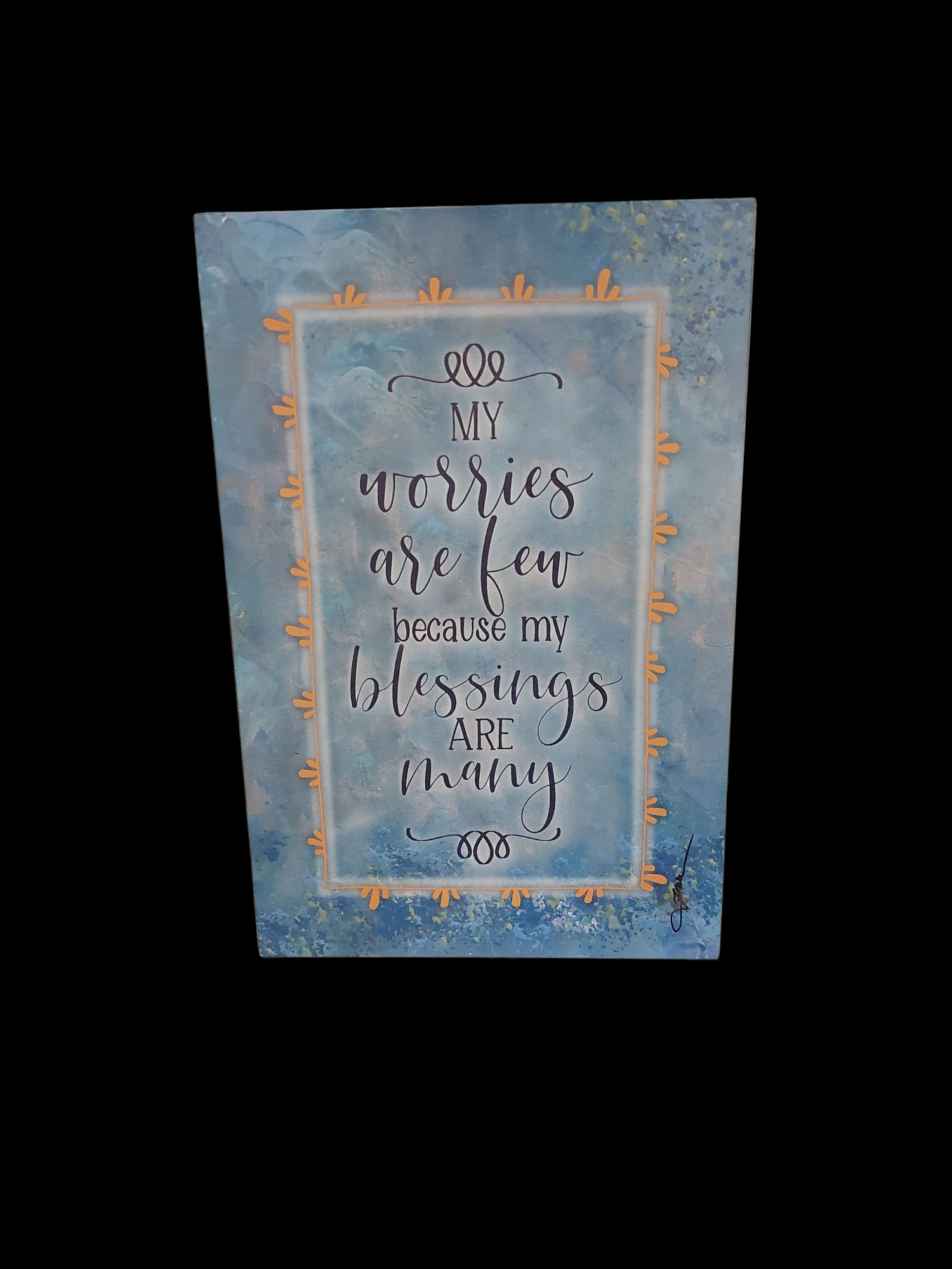 States, “My worries are few because my blessings are many.” Either hangs on wall or sits on table. Stands 6x9 inches.